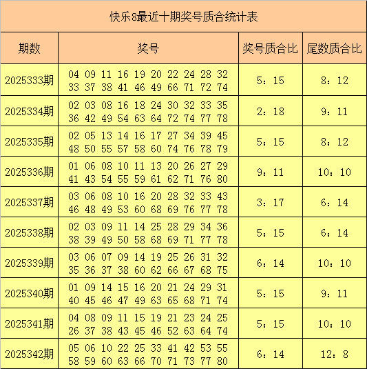 福彩快意8第2025342期开出奖号:05 06 10 22 25 33 41 42 53 55 58 59 60 63 66 70 71 73 77 80,其中奖号质合比为6:14,奖号余数质合比为12:8。