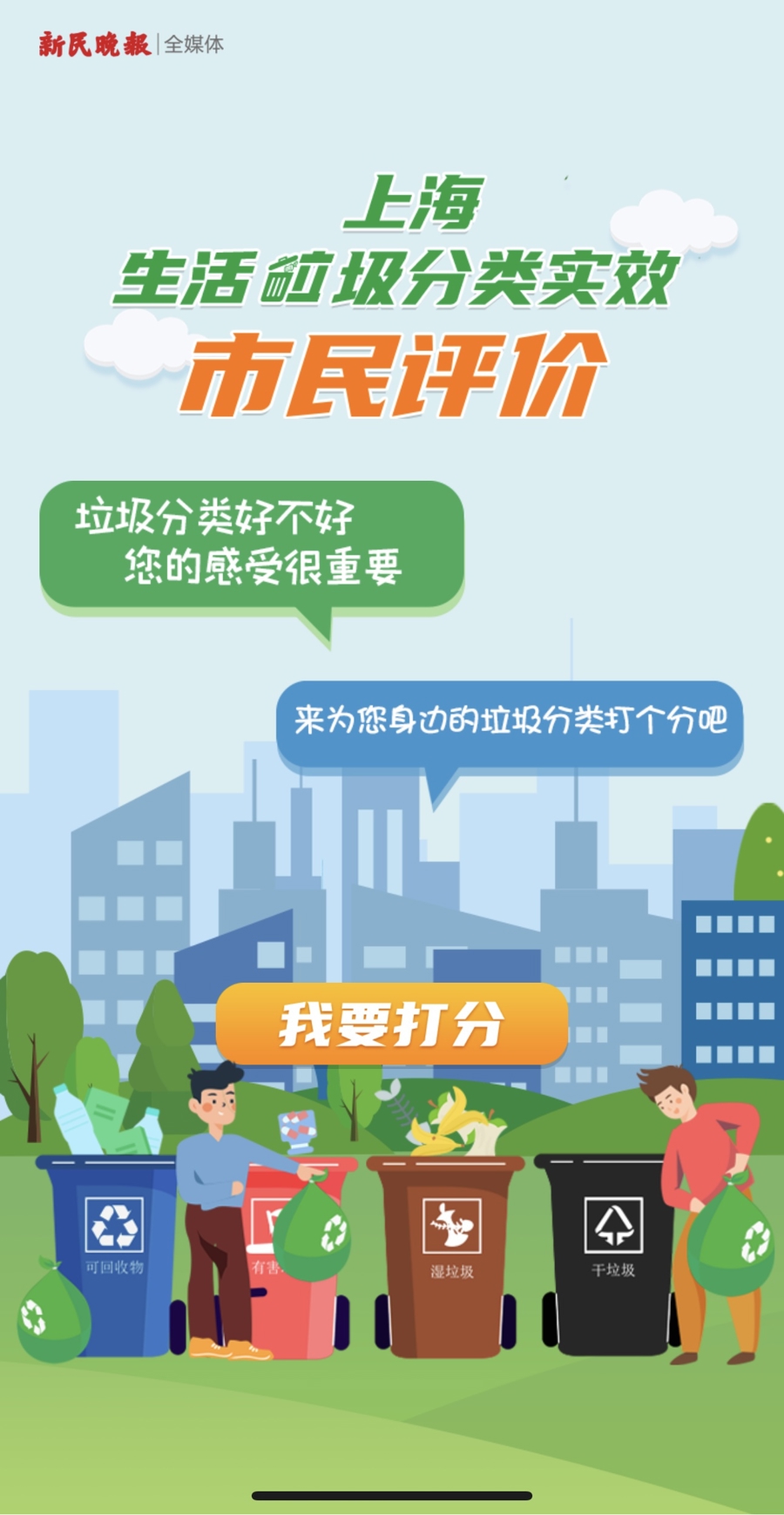 12月6日至12月12日,上海市生活垃圾分类减量推进工作联席会议办公室联合新民晚报第八次开展“上海生活垃圾分类实效市民评价”,邀请市民为身边的垃圾分类打分。市民可通过“新民晚报”微信公众号或扫二维码参与打分和评价。